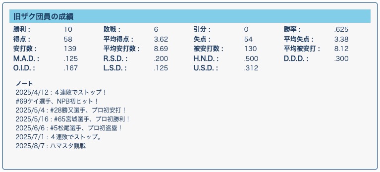 ザクレロ団長-----まあ、この辺のオリジナル項目は特に偏りがないと話のネタにはならないんだが。でも得点と失点の関係からも全体的に熱い試合で勝利って感じだった、ってことかな。